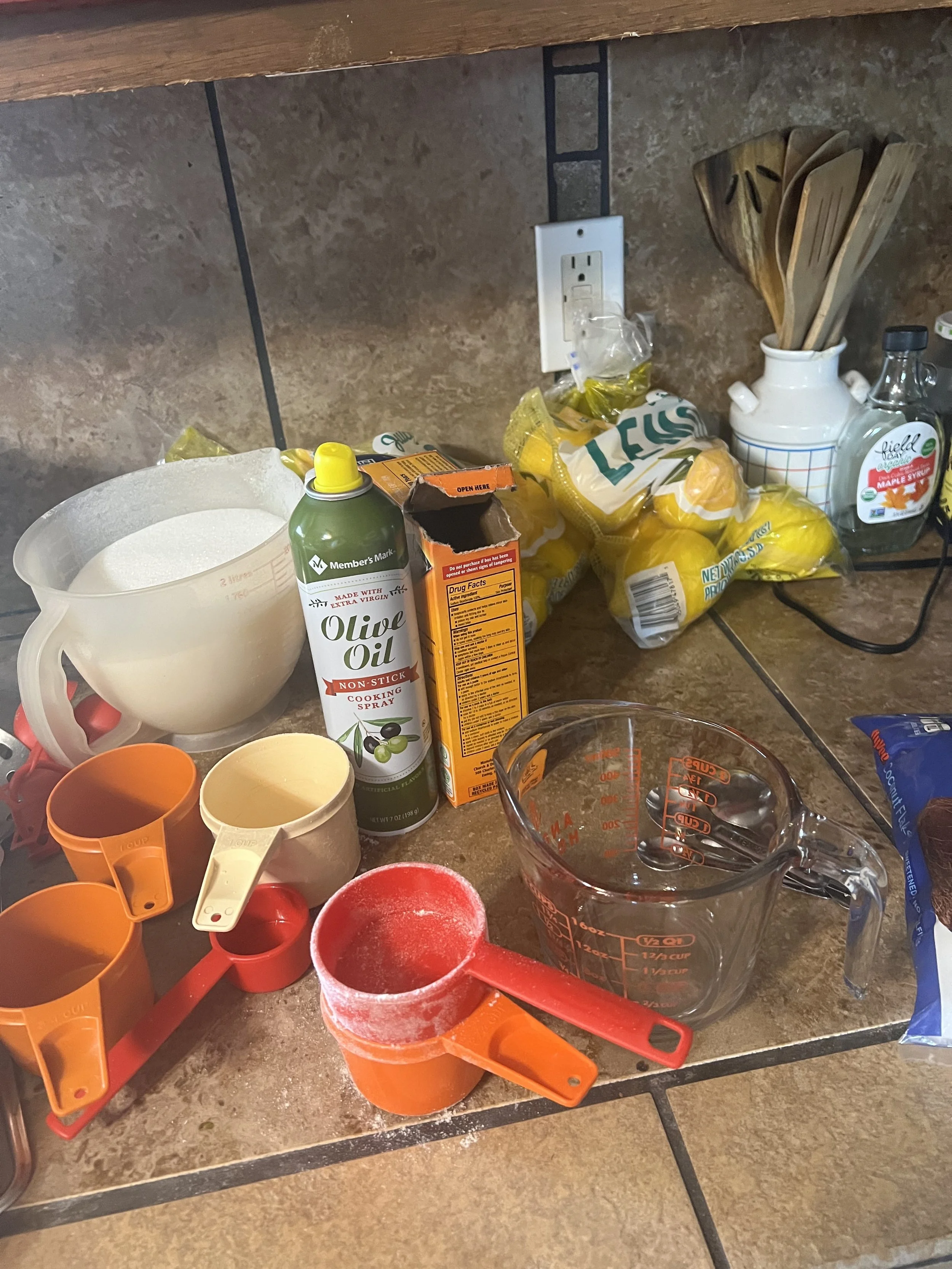 Assorted homemade cookies on display, some wrapped in plastic, with a mug labeled "Mornings are Bull!" and a box labeled "Amazingly Graced" in the background.